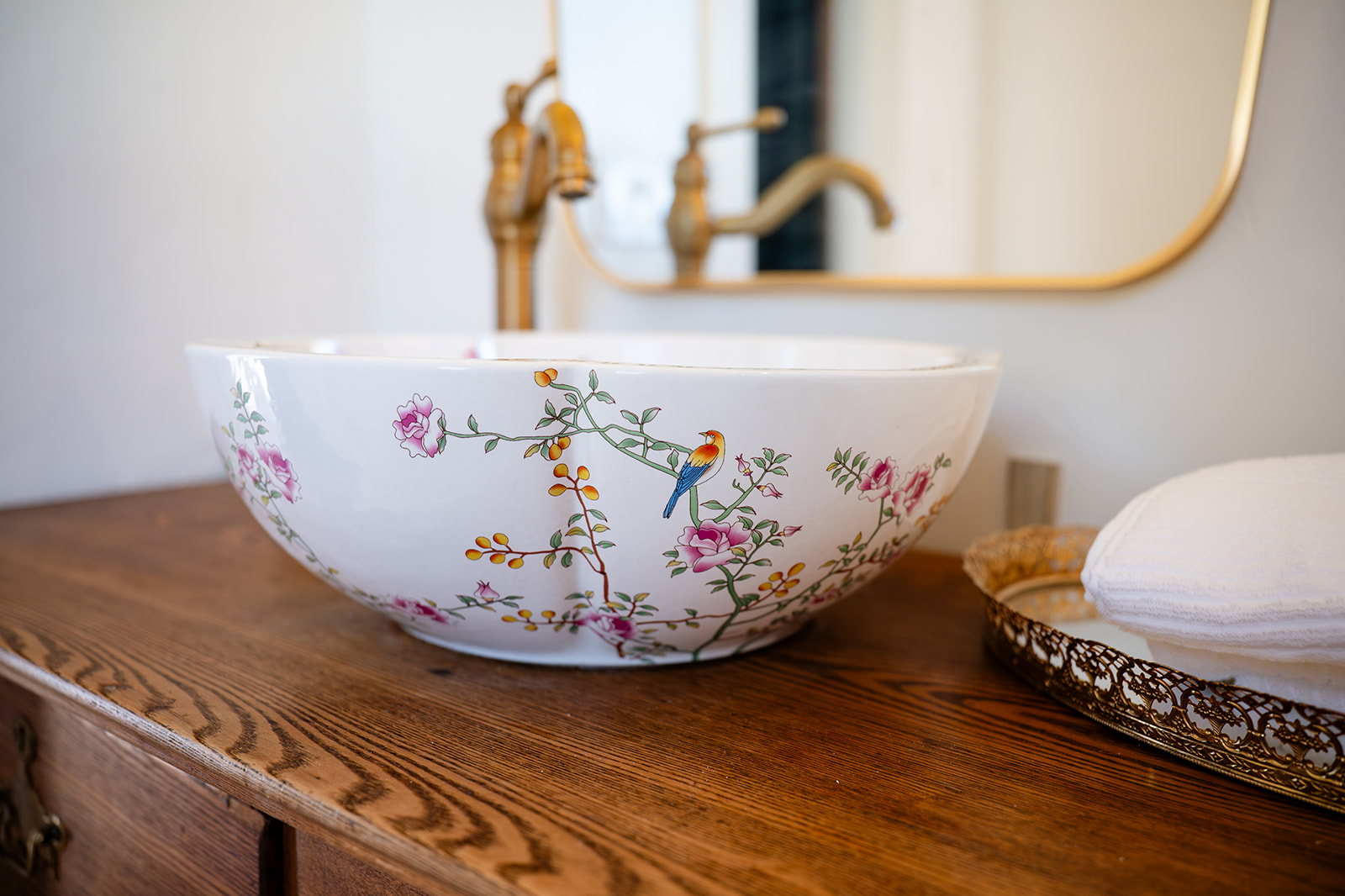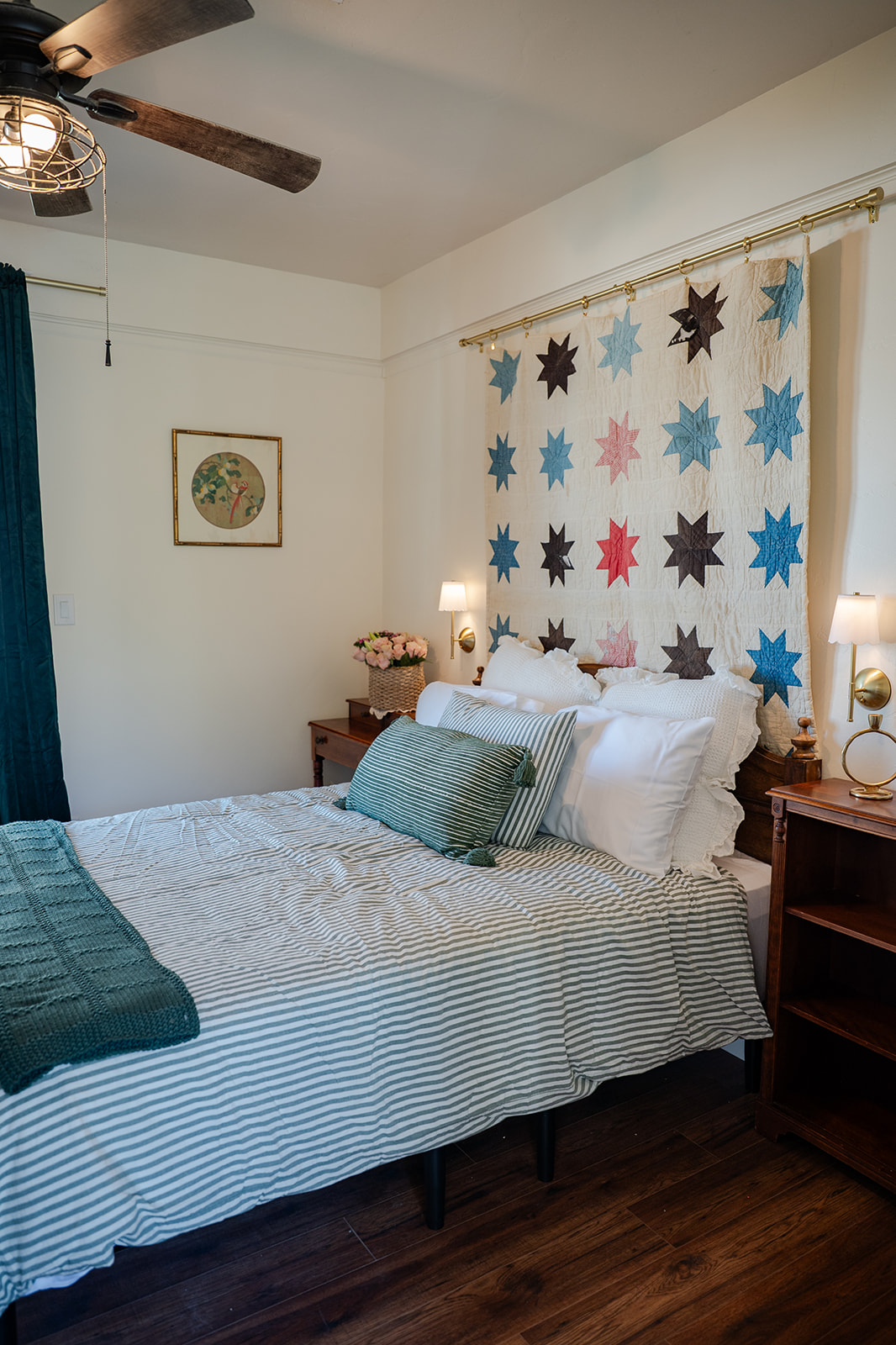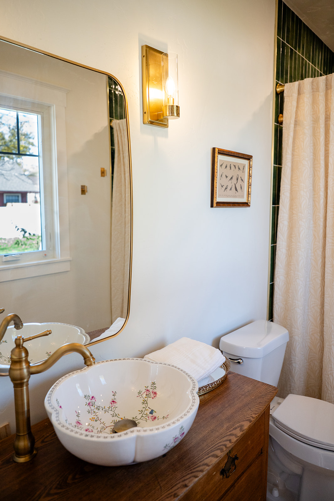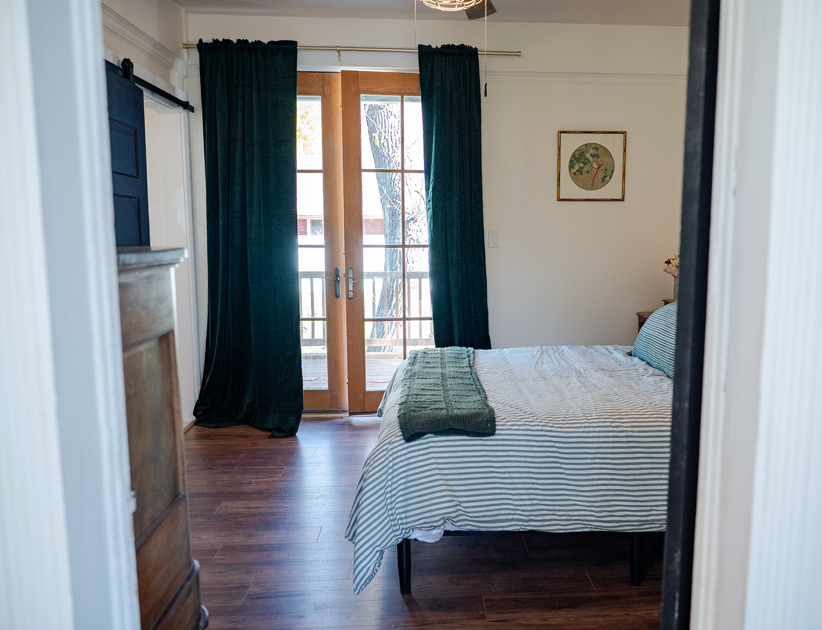 The private en suite includes a spacious roll-in shower framed by rich dark green subway tiles, blending rustic charm with contemporary style. While not ADA-certified, The Nook is fully wheelchair accessible throughout.